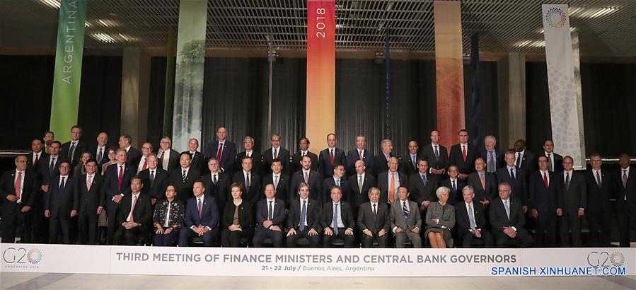 Ministros de Finanzas y presidentes de Bancos Centrales del Grupo de los 20 (G20), posan para una fotografía grupal durante la 3 Reunión de ministros de Finanzas y presidentes de Bancos Centrales del G20, en el Centro de Exposiciones y Convenciones (CEC) de la ciudad de Buenos Aires, capital de Argentina, el 21 de julio de 2018. Al menos 57 representantes, entre ministros de Finanzas y presidentes de Bancos Centrales de los países que integran el G20, se dan cita en el Centro de Exposiciones y Convenciones (CEC) de Buenos Aires, para llevar a cabo su tercera reunión de cara a la Cumbre de jefes de Estado del G20 del 30 de noviembre y 1 de diciembre próximos. El encuentro cuenta con la participación de 23 ministros de Finanzas, 14 presidentes de Bancos Centrales, 10 titulares de organizaciones internacionales y otros representantes. (Xinhua/Str)