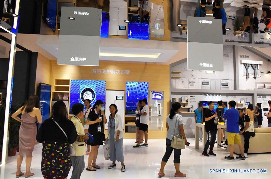 SHANDONG, julio 21, 2018 (Xinhua) -- Personas visitan la Exposición Internacional de Electrónica de Consumo de China 2018, en Qingdao, provincia de Shandong, en el este de China, el 21 de julio de 2018. La exposición de electrónica de cuatro días de duración comenzó el viernes. (Xinhua/Li Ziheng)