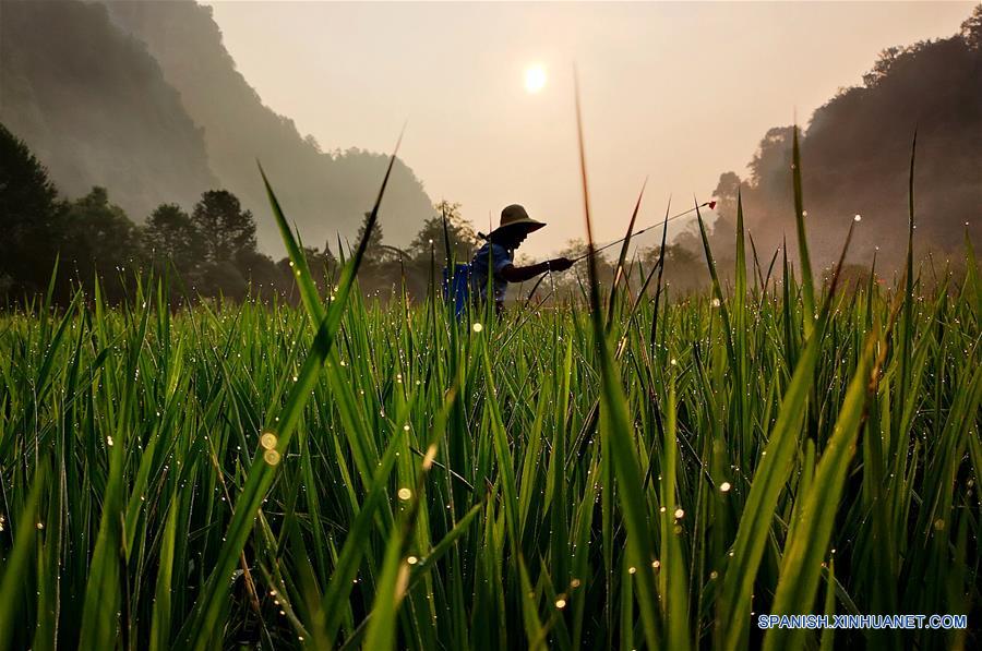 HUNAN, julio 23, 2018 (Xinhua) -- Un agricultor trabaja en el campo en el distrito Wulingyuan de la ciudad de Zhangjiajie, provincia de Hunan, en el centro de China, el 23 de julio de 2018. El Gran Calor, o Dashu en el calendario lunar chino, que significa el día más caluroso del verano, cae el 23 de julio este a?o. (Xinhua/Wu Yongbing)