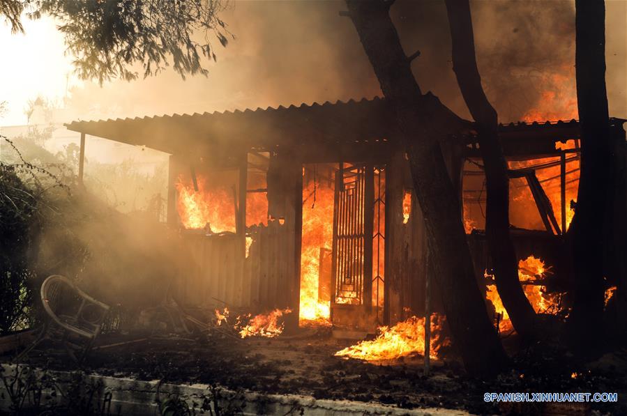 Llamas consumen una casa durante un incendio forestal en la localidad de Kineta, cerca de Atenas, Grecia, el 23 de julio de 2018. Autoridades locales declararon el lunes un estado de emergencia en Atica debido a tres grandes incendios forestales que asolan suburbios y playas turísticas cerca de la capital griega. Cientos de residentes han tenido que abandonar sus hogares y buscar refugio en el mar, informó la agencia nacional griega AMNA. (Xinhua/Lefteris Partsalis)
