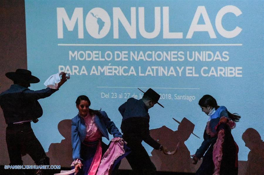 SANTIAGO, julio 23, 2018 (Xinhua) -- Personas con trajes típicos bailan "La Cueca" durante la inauguración del 2 Modelo de Naciones Unidas para América Latina y el Caribe (MONULAC), en la Universidad de Santiago, en Santiago, capital de Chile, el 23 de julio de 2018. De acuerdo con información de la prensa local, la ex presidenta chilena inauguró el 2 MONULAC con la conferencia magistral "Avances y desafíos en materia de igualdad y equidad de género en Latinoamérica y el Caribe", donde habló de su experiencia como Directora Ejecutiva de la Organización de las Naciones Unidas (ONU) Mujeres entre 2010 y 2013. El MONULAC es un ejercicio donde estudiantes universitarios provenientes de diversos países de Latinoamérica simulan el trabajo que realizan los delegados de la ONU. (Xinhua/Jorge Villegas)