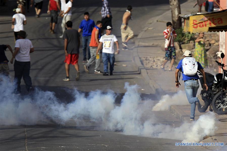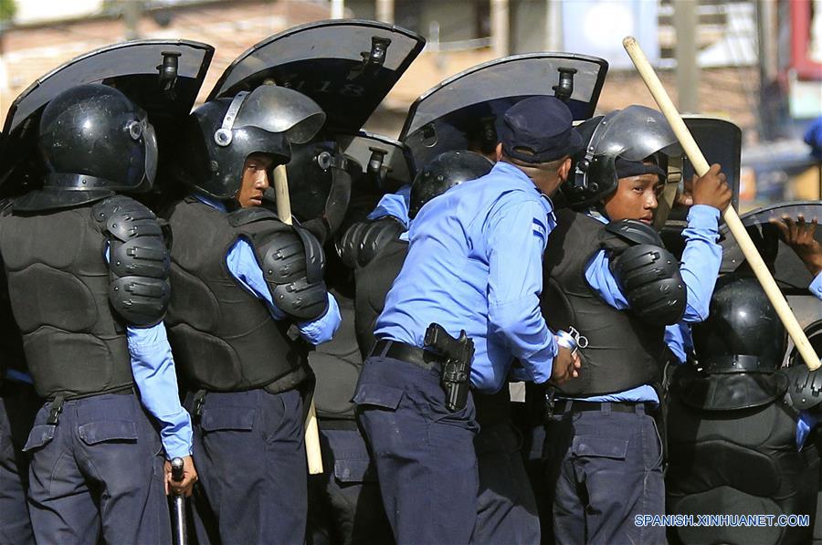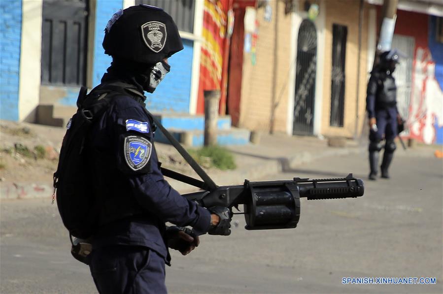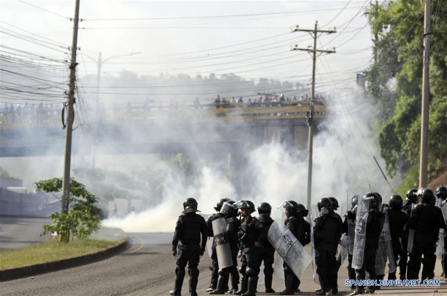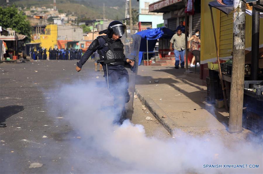 Un elemento de la policía hondure?a reacciona durante el desalojo de transportistas que bloquean una calle, en el marco del paro nacional de transportistas, en Tegucigalpa, Honduras, el 23 de julio de 2018. Los transportistas de Honduras reanudaron el lunes sus protestas para exigir una rebaja al precio de los combustibles, tras romperse el pasado fin de semana un diálogo con el gobierno. (Xinhua/Rafael Ochoa)