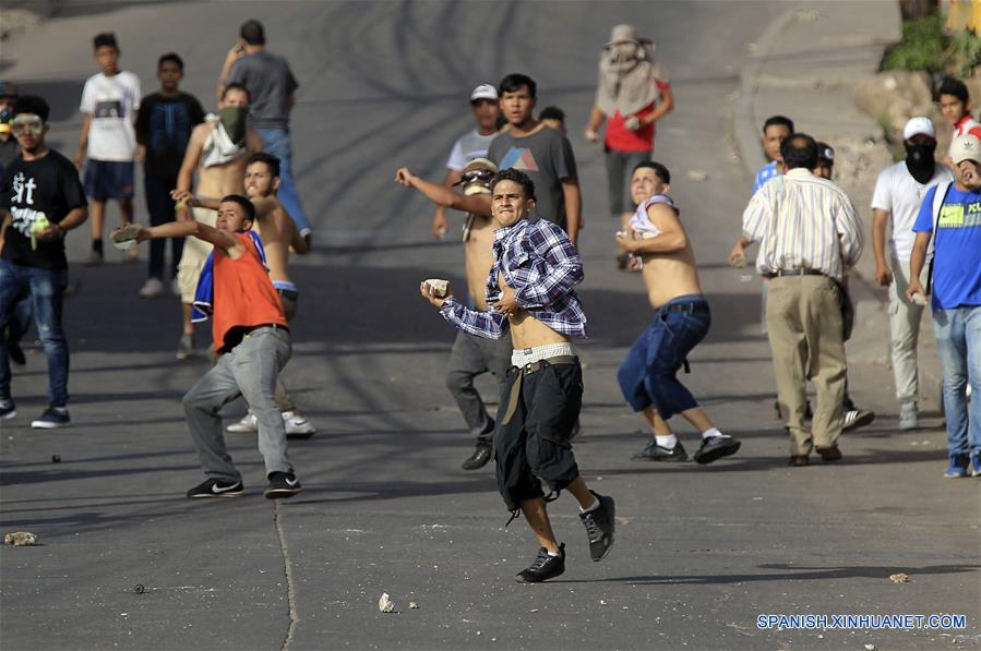 Jóvenes participan en un enfrentamiento con elementos de la policía durante el desalojo de transportistas que bloquean una calle, en el marco del paro nacional de transportistas, en Tegucigalpa, Honduras, el 23 de julio de 2018. Los transportistas de Honduras reanudaron el lunes sus protestas para exigir una rebaja al precio de los combustibles, tras romperse el pasado fin de semana un diálogo con el gobierno. (Xinhua/Rafael Ochoa)