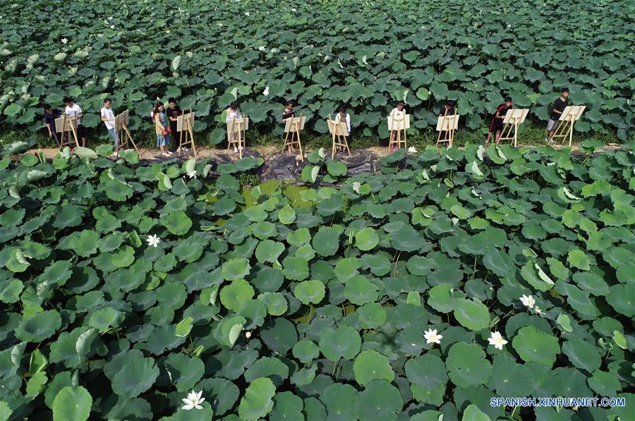 HEBEI, julio 24, 2018 (Xinhua) -- Un grupo de estudiantes elabora pinturas de flores de loto, en el condado de Longyao, provincia de Hebei, en el norte de China, el 24 de julio de 2018. (Xinhua/Mu Yu)