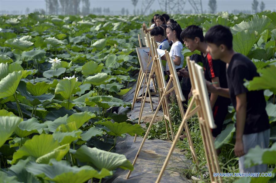 HEBEI, julio 24, 2018 (Xinhua) -- Un grupo de estudiantes elabora pinturas de flores de loto, en el condado de Longyao, provincia de Hebei, en el norte de China, el 24 de julio de 2018. (Xinhua/Mu Yu)