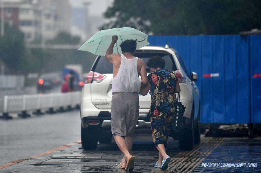 TIANJIN, julio 24, 2018 (Xinhua) -- Peatones caminan bajo la lluvia, en el distrito de Nankai de la municipalidad de Tianjin, en el norte de China, el 24 de julio de 2018. Las fuertes precipitaciones provocadas por el tifón Ampil afectaron el martes a Beijing y las zonas vecinas, causando retrasos en vuelos y evacuaciones de residentes, según las autoridades de control de inundaciones de la ciudad. (Xinhua/Li Ran)