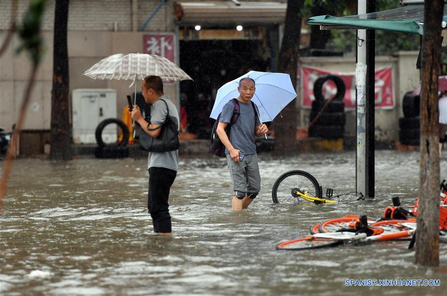 TIANJIN, julio 24, 2018 (Xinhua) -- Peatones caminan a través de una calle inundada, en el distrito de Nankai de la municipalidad de Tianjin, en el norte de China, el 24 de julio de 2018. Las fuertes precipitaciones provocadas por el tifón Ampil afectaron el martes a Beijing y las zonas vecinas, causando retrasos en vuelos y evacuaciones de residentes, según las autoridades de control de inundaciones de la ciudad. (Xinhua/Li Ran)