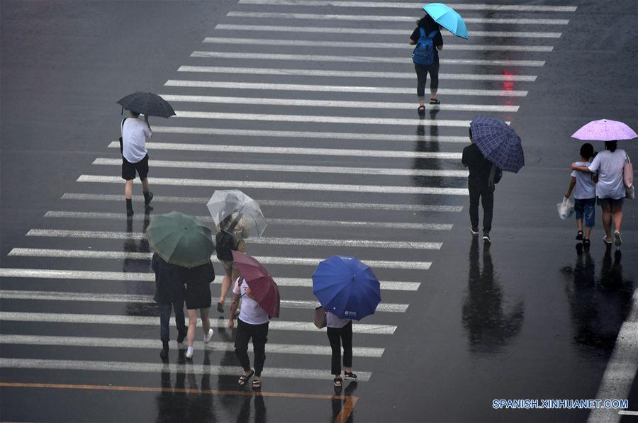 TIANJIN, julio 24, 2018 (Xinhua) -- Peatones caminan bajo la lluvia, en el distrito de Nankai de la municipalidad de Tianjin, en el norte de China, el 24 de julio de 2018. Las fuertes precipitaciones provocadas por el tifón Ampil afectaron el martes a Beijing y las zonas vecinas, causando retrasos en vuelos y evacuaciones de residentes, según las autoridades de control de inundaciones de la ciudad. (Xinhua/Li Ran)
