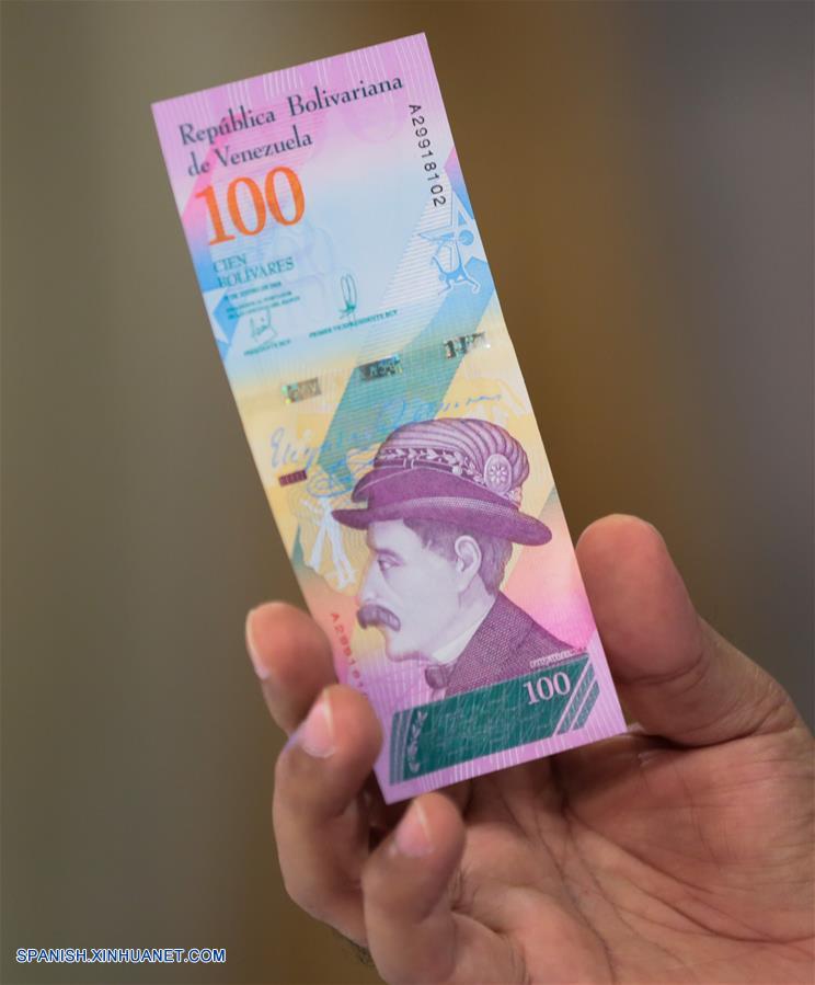 Imagen cedida por Presidencia de Venezuela, de la vista de un billete de 100 bolívares, en el Salón Perú en Caracas, Venezuela, el 25 de julio de 2018. El presidente de Venezuela, Nicolás Maduro, anunció el miércoles la postergación de la Reconversión Monetaria, que entraría en vigencia inicialmente el 4 de agosto próximo, para comenzar el 20 del mismo mes. (Xinhua/Presidencia de Venezuela)
