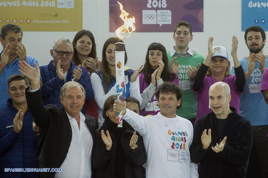 BUENOS AIRES, julio 26, 2018 (Xinhua) -- El presidente del Comité Olímpico Argentino (COA), Gerardo Werthein (i-frente), el medallista olímpico argentino, Juan Esteban Curuchet (2-d-frente), y el alcalde de Buenos Aires, Horacio Rodríguez Larreta (d-frente), participan durante la ceremonia de recepción de la llama olímpica de la juventud de Buenos Aires 2018, en el Centro Acuático del Parque Olímpico de la Juventud, en la ciudad de Buenos Aires, capital de Argentina, el 26 de julio de 2018. La llama olímpica de la juventud de Buenos Aires 2018 ya ilumina la capital argentina, tras ser encendida en una ceremonia desarrollada el jueves en el Parque Acuático, al sur de la ciudad. Durante 12 días, Buenos Aires será la sede de los III Juegos Olímpicos de la Juventud, luego de que los primeros fueron en Singapur en 2010 y los segundos en la ciudad china de Nanjing en 2014. (Xinhua/Alberto Raggio)