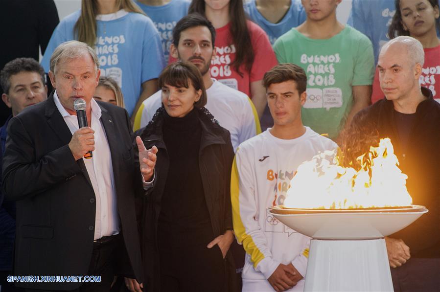 BUENOS AIRES, julio 26, 2018 (Xinhua) -- El presidente del Comité Olímpico Argentino (COA), Gerardo Werthein (i-frente), pronuncia un discurso durante la ceremonia recepción de la llama olímpica de la juventud de Buenos Aires 2018, en el Centro Acuático del Parque Olímpico de la Juventud, en la ciudad de Buenos Aires, capital de Argentina, el 26 de julio de 2018. La llama olímpica de la juventud de Buenos Aires 2018 ya ilumina la capital argentina, tras ser encendida en una ceremonia desarrollada el jueves en el Parque Acuático, al sur de la ciudad. Durante 12 días, Buenos Aires será la sede de los III Juegos Olímpicos de la Juventud, luego de que los primeros fueron en Singapur en 2010 y los segundos en la ciudad china de Nanjing en 2014. (Xinhua/Alberto Raggio)