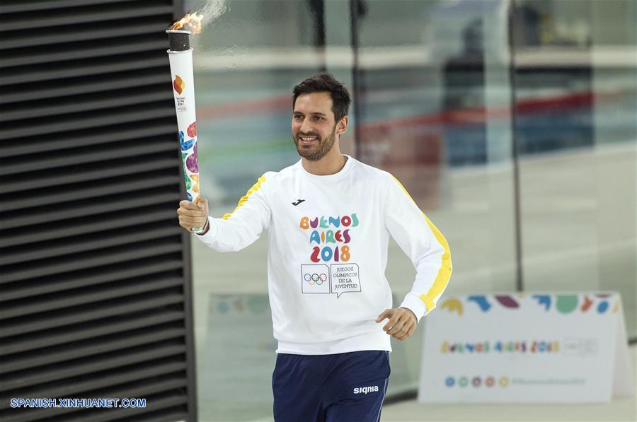 El medallista olímpico argentino, Sebastián Crismanich, lleva la antorcha durante la ceremonia de recepción de la llama olímpica de la juventud de Buenos Aires 2018, en el Centro Acuático del Parque Olímpico de la Juventud, en la ciudad de Buenos Aires, capital de Argentina, el 26 de julio de 2018. (Xinhua/Alberto Raggio)