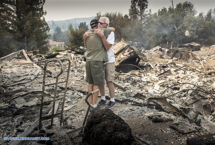 CALIFORNIA, julio 27, 2018 (Xinhua) -- Personas se abrazan entre escombros de una casa quemada, en la ciudad de Redding, condado de Shasta, estado de California, Estados Unidos, el 27 de julio de 2018. El llamado Incendio Carr, de rápido desplazamiento, comenzó el lunes, ha arrasado cerca de 18,000 hectáreas y para el viernes por la ma?ana su contención era de apenas tres por ciento. Al menos 65 estructuras han sido destruidas, 55 han sido da?adas y cerca de 5,000 son amenazadas por las llamas, dijo el Departamento de Silvicultura y Protección contra Incendios (CalFire)