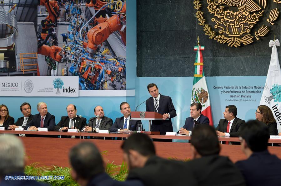 CIUDAD DE MEXICO, julio 27, 2018 (Xinhua) -- Imagen cedida por la Presidencia de México del presidente mexicano, Enrique Pe?a Nieto (4-d-atrás), pronunciando un discurso durante la reunión plenaria del Consejo Nacional de la Industria Maquiladora y Manufacturera de Exportación (INDEX), en la Ciudad de México, capital de México, el 27 de julio de 2018. El presidente de México, Enrique Pe?a Nieto, manifestó el viernes su confianza en que se alcancen acuerdos sobre la modernización del Tratado de Libre Comercio de América del Norte (TLCAN) en agosto próximo. (Xinhua/Presidencia de México)