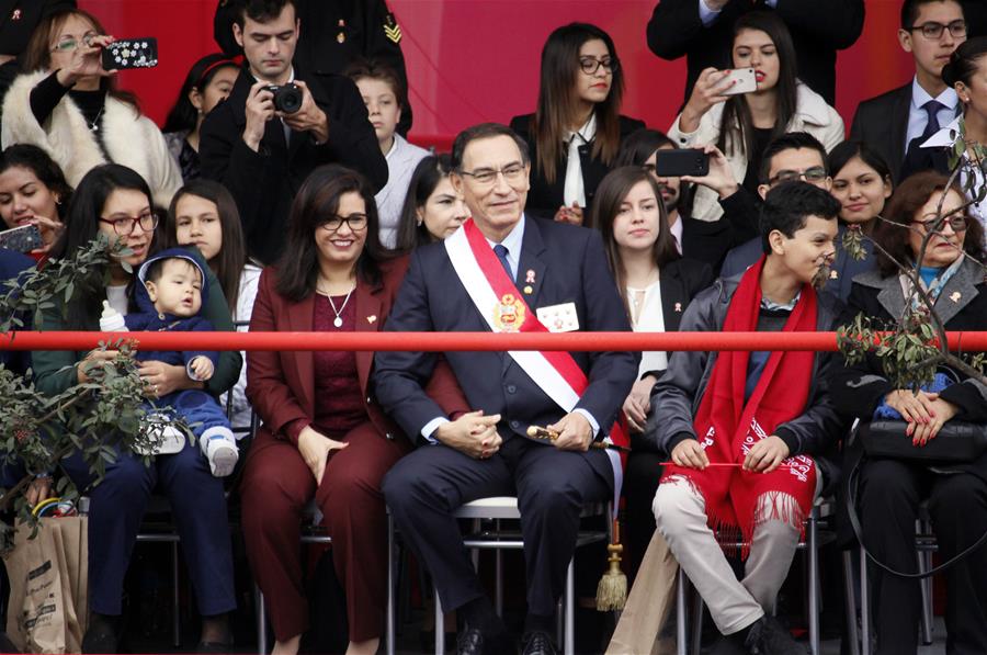 LIMA, julio 29, 2018 (Xinhua) -- El presidente peruano Martín Vizcarra (c), observa la Gran Parada y Desfile Cívico-Militar, en el marco de las celebraciones del 197 Aniversario de la Independencia de Perú, en la ciudad de Lima, Perú, el 29 de julio de 2018. De acuerdo con información de la prensa local, residentes de Lima y del interior del país asistieron el domingo a la avenida Brasil para presenciar la Gran Parada y Desfile Cívico-Militar y celebrar el 197 Aniversario de la Independencia de Perú. (Xinhua/Luis Camacho)