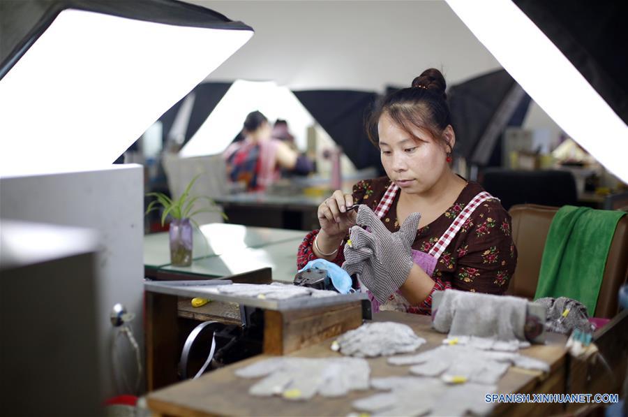 HEBEI, julio 31, 2018 (Xinhua) -- Una trabajadora elabora un guante de malla de alambre de acero inoxidable en un taller, en el condado de Anping, provincia de Hebei, en el norte de China, el 31 de julio de 2018. Como un pilar local, la industria de tela metálica es mejorada mediante la optimización de los recursos y el aumento de las inversiónes en innovación científica y tecnológica. (Xinhua/Zhu Xudong)