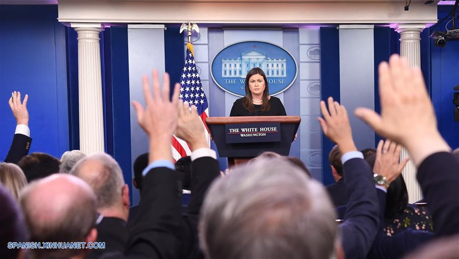 La vocera de la Casa Blanca, Sarah Sanders (atrás), participa en una conferencia de prensa en la Casa Blanca, en Washington D.C., Estados Unidos, el 2 de agosto de 2018. La Casa Blanca indicó el jueves que el presidente de Estados Unidos, Donald Trump, respondió a una nueva carta de Kim Jong Un, máximo líder de República Popular Democrática de Corea (RPDC), y que la carta de Trump será entregada "pronto". (Xinhua/Liu Jie)