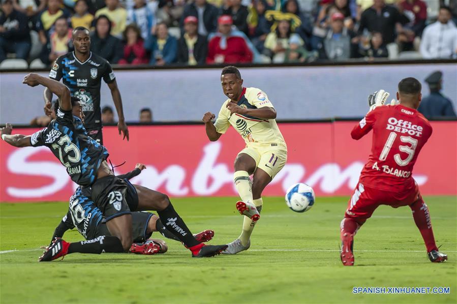 El jugador Andrés Ibargüen (c), de América, dispara el balón durante un partido correspondiente a la Jornada 3 del Torneo Apertura 2018 de la Liga MX, ante Pachuca, celebrado en el Estadio Hidalgo, en la ciudad de Pachuca, estado de Hidalgo, México, el 4 de agosto de 2018. (Xinhua/César Vicu?a)