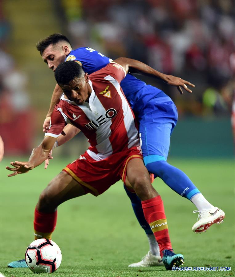 AVEIRO, agosto 4, 2018 (Xinhua) -- Jugadores de CD Aves festejan una anotación durante un partido correspondiente a la final de la Supercopa de Portugal 2018, ante FC Porto, celebrado en el Estadio Municipal de Aveiro, en Aveiro, Portugal, el 4 de agosto de 2018. (Xinhua/Zhang Liyun)
