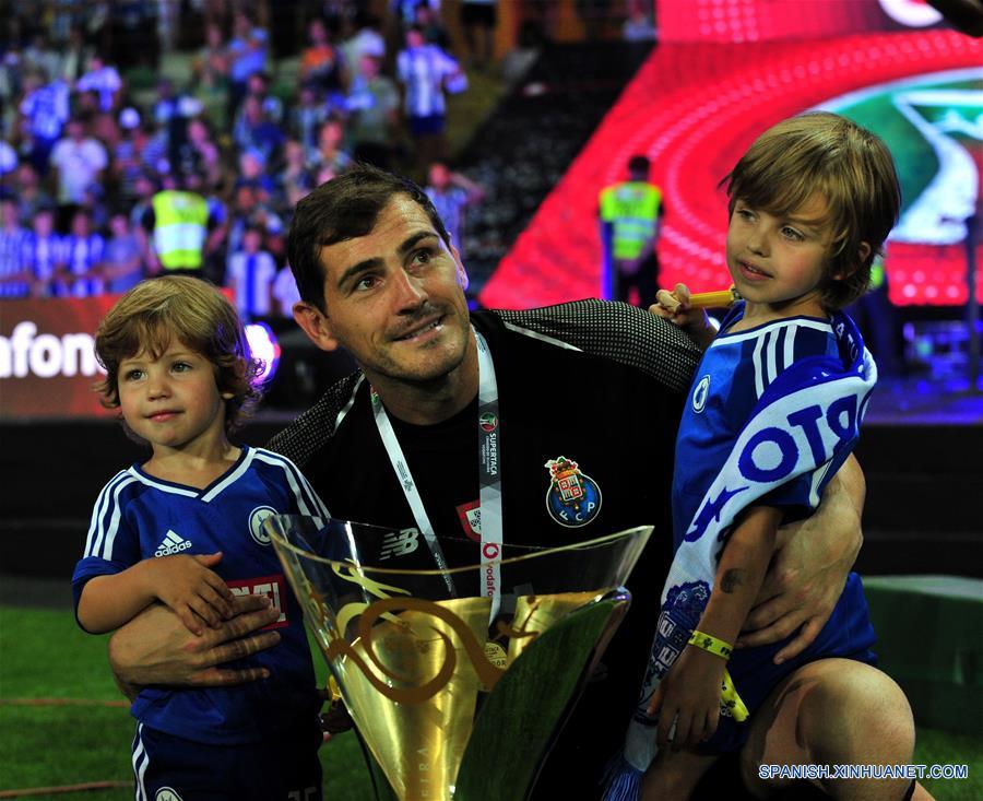 AVEIRO, agosto 4, 2018 (Xinhua) -- El guardameta Iker Casillas (c), de FC Porto, festeja al término de un partido correspondiente a la final de la Supercopa de Portugal 2018, ante CD Aves, celebrado en el Estadio Municipal de Aveiro, en Aveiro, Portugal, el 4 de agosto de 2018. (Xinhua/Zhang Liyun)