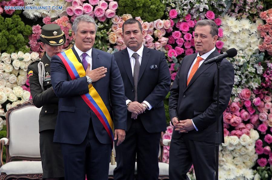 El presidente de Colombia, Iván Duque (i-frente), reacciona durante su ceremonia de juramentación como nuevo mandatario colombiano, en la Plaza Bolívar, en Bogotá, capital de Colombia, el 7 de agosto de 2018. El presidente colombiano, Iván Duque, tomó el martes juramento como el mandatario número 60 del país andino, y se convirtió en el cuarto jefe de Estado más joven en tomar posesión de ese cargo, que asumirá por un periodo de cuatro a?os y reemplazará al saliente Juan Manuel Santos. (Xinhua/Diego Pineda/COLPRENSA)
