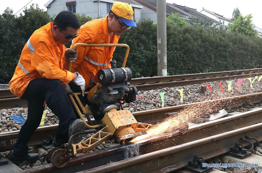 Trabajadores revisan el tendido férreo, en Shanghai, en el este de China, el 7 de agosto de 2018. El personal de mantenimiendo del ferrocarril en Shanghai permanece en sus puestos de trabajo a pesar del clima caluroso para garantizar la seguridad de los pasajeros. (Xinhua/Chen Fei)