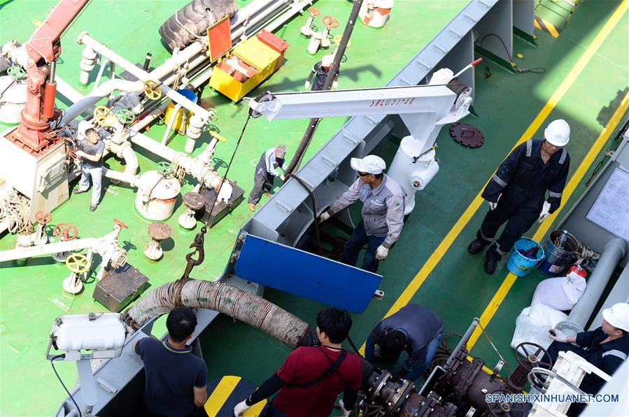 A BORDODEL BUQUE TIAN'EN, agosto 7, 2018 (Xinhua) -- Miembros de la tripulación participan en el único reabastecimiento de combustible del buque Tian'en de la compa?ía COSCO Shipping Specialized Carriers Co., Ltd. de China en aguas del mar de Busan, mientras navega hacia Europa través de la "Ruta de la Seda Polar", el 7 de agosto de 2018. (Xinhua/Liu Hongxia)