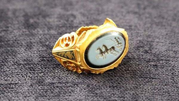 En el anillo se puede ver un ónix negro adornado con una imagen de la diosa grecolatina Victoria conduciendo su carro. Tiene un peso de 48 gramos y, aunque todavía no ha sido sometido a los análisis pertinentes, expertos del Museo Británico afirman que fue fabricado entre el 200 d.C. y el 300 d.C.