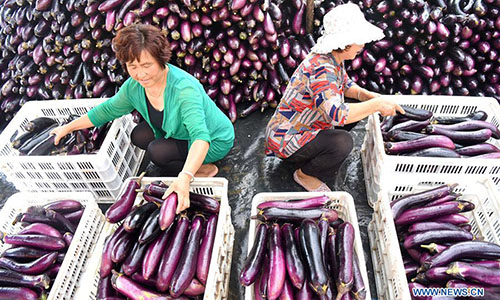 Zibo, Shandong, 09/08/2018 (Pueblo en Línea) – Los aldeanos cosechan berenjenas en la aldea Beizhangliang, YiYuan, Zibo, provincia de Shandong, 7 de agosto del 2018. (Foto: Xinhua/ Zhao Dongshan)