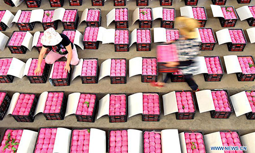 Los aldeanos cosechan frutas en la aldea Dong'an, YiYuan, Zibo,provincia de Shandong, 7 de agosto del 2018. (Foto: Xinhua/ Zhao Dongshan)