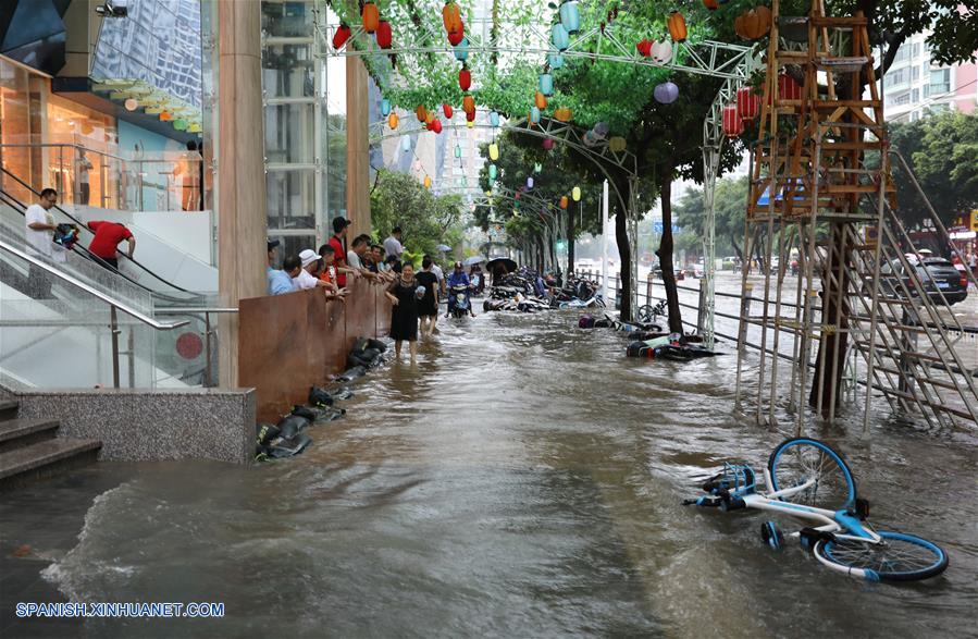 HAINAN, agosto 10, 2018 (Xinhua) -- Bicicletas y motocicletas son arrastradas por la inundación, en Haikou, provincia de Hainan, en el sur de China, el 10 de agosto de 2018. Hainan fue afectada el viernes por lluvias torrenciales bajo la influencia de una depresión tropical, lo que disparó una alerta roja por lluvias torrenciales en siete ciudades y condados, incluyendo Haikou. (Xinhua/Wang Junfeng)