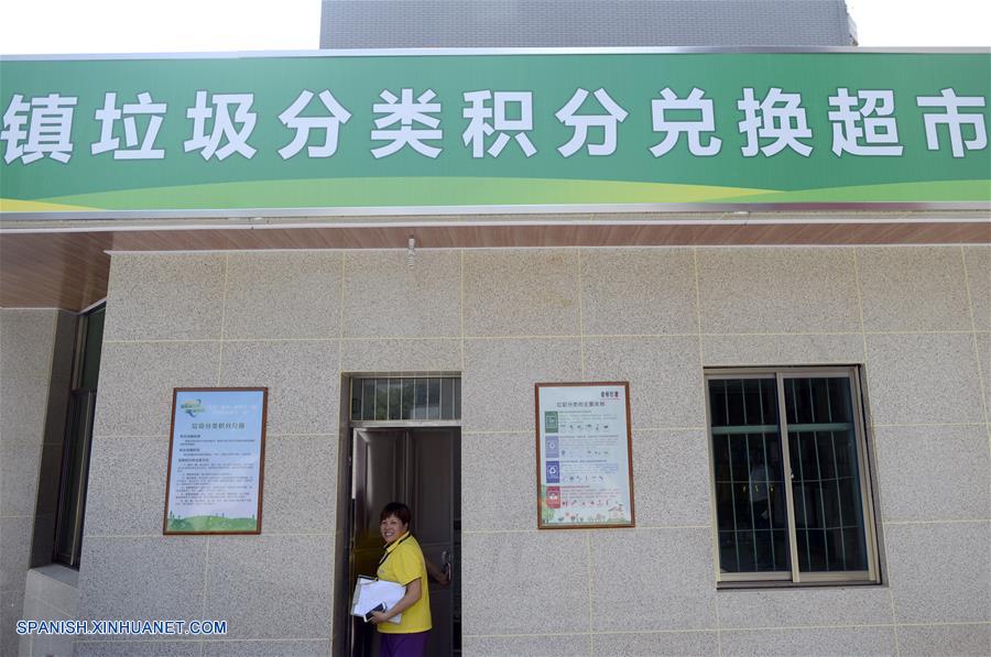 ZHEJIANG, agosto 9, 2018 (Xinhua) -- Vista de un supermercado establecido para promover la clasificación de los desechos, en el municipio de Lipu de la ciudad de Zhuji, provincia de Zhejiang, en el este de China, el 9 de agosto de 2018. El gobierno local ha desarrollado un mecanismo para animar a las personas a hacer la clasificación de los desechos, en el que los residentes pueden canjear productos con los puntos obtenidos de la clasificación de desechos o respondiendo preguntas sobre la clasificación de desechos. (Xinhua/Han Chuanhao)