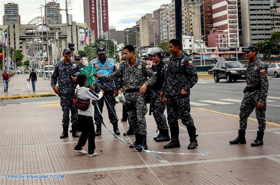 CARACAS, agosto 10, 2018 (Xinhua) -- Elementos de la Policía Nacional Bolivariana (PNB) ayudan a un ni?o a volar un papalote durante el evento "Mil papagayos por La Paz", en Caracas, capital de Venezuela, el 10 de agosto de 2018. De acuerdo con información de la prensa local, el evento "Mil papagayos por La Paz", que incluyó presentaciones de música, teatro y poesía, así como una actividad para crear "papagayos", como le llaman a los papalotes en Venezuela, se realizó el viernes para reafirmar que el país es un territorio de paz. (Xinhua/Boris Vergara)