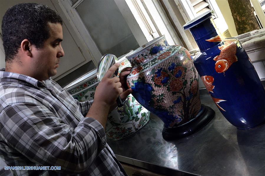 LA HABANA, agosto 10, 2018 (Xinhua) -- Imagen del 9 de agosto de 2018 del arqueólogo cubano, Yosvanis Fornaris, revisando una de las piezas de porcelana china en su oficina en el Museo Nacional de Artes Decorativas (MNAD) de La Habana, en La Habana, Cuba. El arqueólogo cubano Yosvanis Fornaris no sabía que su vida cambiaría cuando en septiembre de 2008 llegó al MNAD de La Habana y su primera tarea fuera resguardar las colecciones ante el inminente embate del huracán Ike. Entrar en contacto con los valiosos fondos del museo, y en especial con las 1,200 piezas de la colección de porcelana china, fue una epifanía profesional que marcaría la vida posterior del estudioso. Desde entonces, a finales de 2008, cuando apenas hacía unos meses de su ingreso a la institución, comenzó la búsqueda de información en bibliotecas para tratar de entender los códigos culturales de la porcelana china. (Xinhua/Joaquín Hernández)