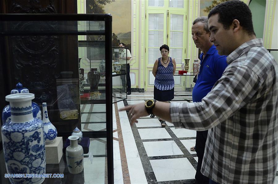 LA HABANA, agosto 10, 2018 (Xinhua) -- Imagen del 9 de agosto de 2018 del arqueólogo cubano, Yosvanis Fornaris (d), mostrado al embajador de Cuba en China, Miguel Angel Ramírez (c), una de las piezas de porcelana china exhibidas en el Museo Nacional de Artes Decorativas (MNAD) de La Habana, en La Habana, Cuba. El arqueólogo cubano Yosvanis Fornaris no sabía que su vida cambiaría cuando en septiembre de 2008 llegó al MNAD de La Habana y su primera tarea fuera resguardar las colecciones ante el inminente embate del huracán Ike. Entrar en contacto con los valiosos fondos del museo, y en especial con las 1,200 piezas de la colección de porcelana china, fue una epifanía profesional que marcaría la vida posterior del estudioso. Desde entonces, a finales de 2008, cuando apenas hacía unos meses de su ingreso a la institución, comenzó la búsqueda de información en bibliotecas para tratar de entender los códigos culturales de la porcelana china. (Xinhua/Joaquín Hernández)