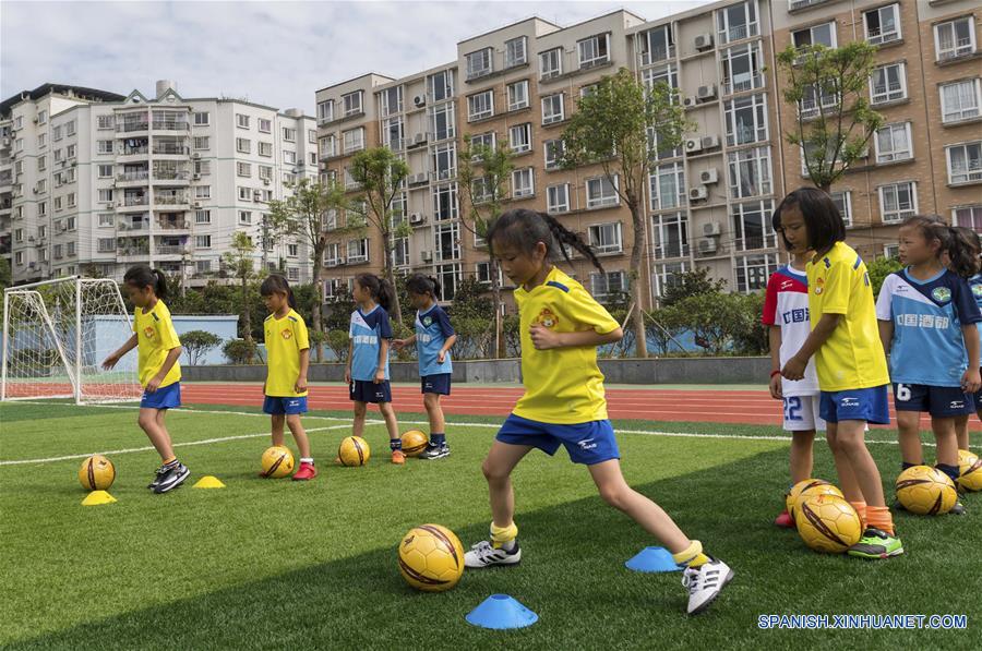 Alumnas practican fútbol en la Escuela Primaria Experimental Renhuai, en Renhuai, provincia de Guizhou, en el suroeste de China, el 9 de agosto de 2018. (Xinhua/Chen Yong)