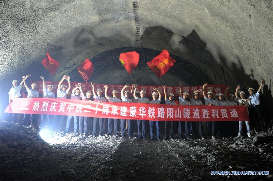 Imagen del 10 de agosto de 2018 de trabajadores festejando cuando completan la construcción del Túnel Yangshan, parte del Ferrocarril Menghua, en Yan'an, provincia de Shaanxi, en el noroeste de China. La construcción del túnel de 11.668 kilómetros de longitud fue completada el viernes. (Xinhua/Zhang Bowen)