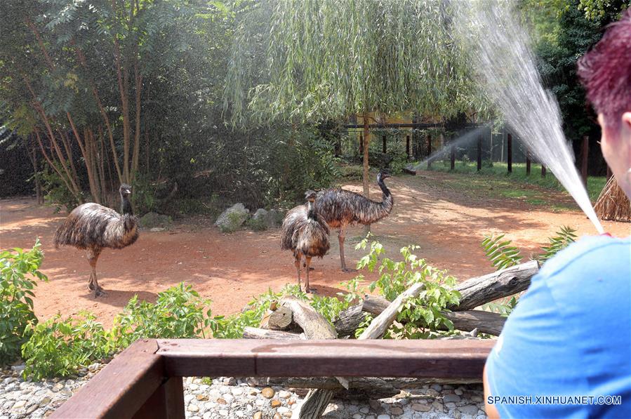 Imagen del 10 de agosto de 2018 de un empleado del zoológico rociando agua sobre los emúes en un zoológico, en Zagreb, capital de Croacia. Una ola de calor continuó afectando Croacia y muchas partes de Europa. (Xinhua/Tomislav Miletic)