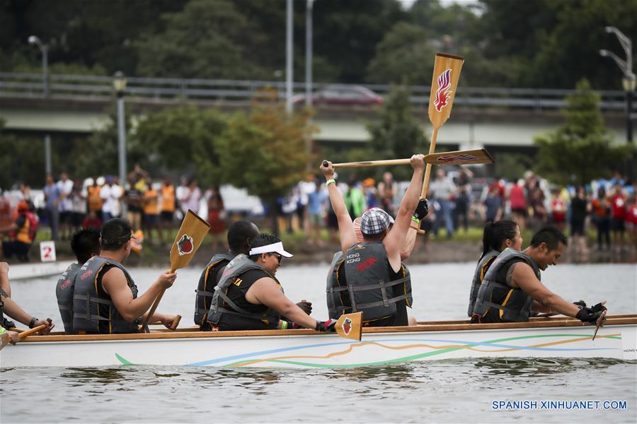 Competidores festejan después de una carrera de botes de dragón del XXVIII Festival Anual de Botes de Dragón de Hong Kong, en el distrito de Queens, Nueva York, Estados Unidos, el 11 de agosto de 2018. De acuerdo con información de la prensa local, el evento de dos días inició el sábado bajo la lluvia, con más de 200 equipos bien entrenados participando en la carrera de botes de dragón de este a?o. (Xinhua/Wang Ying)