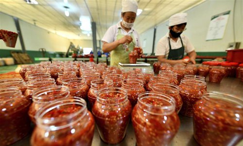 Zunyi, Guizhou, 13/08/2018 (Pueblo en Línea) – Trabajadores elaboran productos a partir de los pimientos rojos en una fábrica de Zunyi, provincia de Guizhou. Con una zona de cultivo de más de 2 millones de MU (alrededor de 133.333 hectáreas) y 40 fábricas de procesamiento, sus productos se abren paso en el extranjero. La industria de la pimienta en Zunyi se ha convertido en una manera eficaz para que los residentes locales logren salir de la pobreza. 11 de agosto del 2018. (Foto: Xinhua/Luo Xinghan)