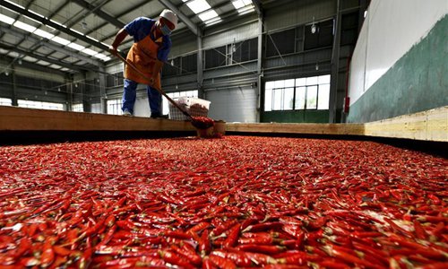 Un aldeano elabora productos a partir de los pimientos rojos en una fábrica de Zunyi, provincia de Guizhou. Con una zona de cultivo de más de 2 millones de MU (alrededor de 133.333 hectáreas) y 40 fábricas de procesamiento, sus productos se abren paso en el extranjero. La industria de la pimienta en Zunyi se ha convertido en una manera eficaz para que los residentes locales logren salir de la pobreza. 11 de agosto del 2018. (Foto: Xinhua/Luo Xinghan)