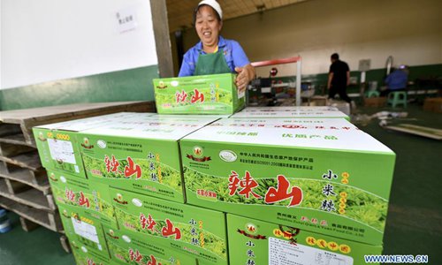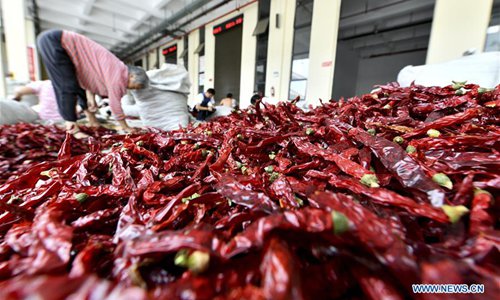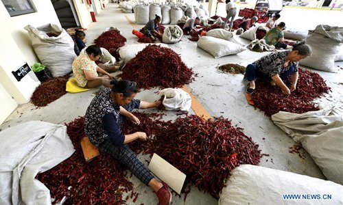 Aldeanos elaboran productos a partir de los pimientos rojos en una fábrica de Zunyi, provincia de Guizhou. Con una zona de cultivo de más de 2 millones de MU (alrededor de 133.333 hectáreas) y 40 fábricas de procesamiento, sus productos se abren paso en el extranjero. La industria de la pimienta en Zunyi se ha convertido en una manera eficaz para que los residentes locales logren salir de la pobreza. 11 de agosto del 2018. (Foto: Xinhua/Luo Xinghan)