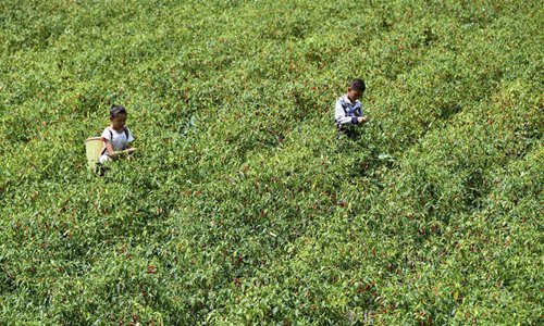 Ni?os se unen a la recolección de pimientos rojos frescos en Zunyi, provincia de Guizhou. Con una zona de cultivo de más de 2 millones de MU (alrededor de 133.333 hectáreas) y 40 fábricas de procesamiento, sus productos se abren paso en el extranjero. La industria de la pimienta en Zunyi se ha convertido en una manera eficaz para que los residentes locales logren salir de la pobreza. 11 de agosto del 2018. (Foto: Xinhua/Luo Xinghan)