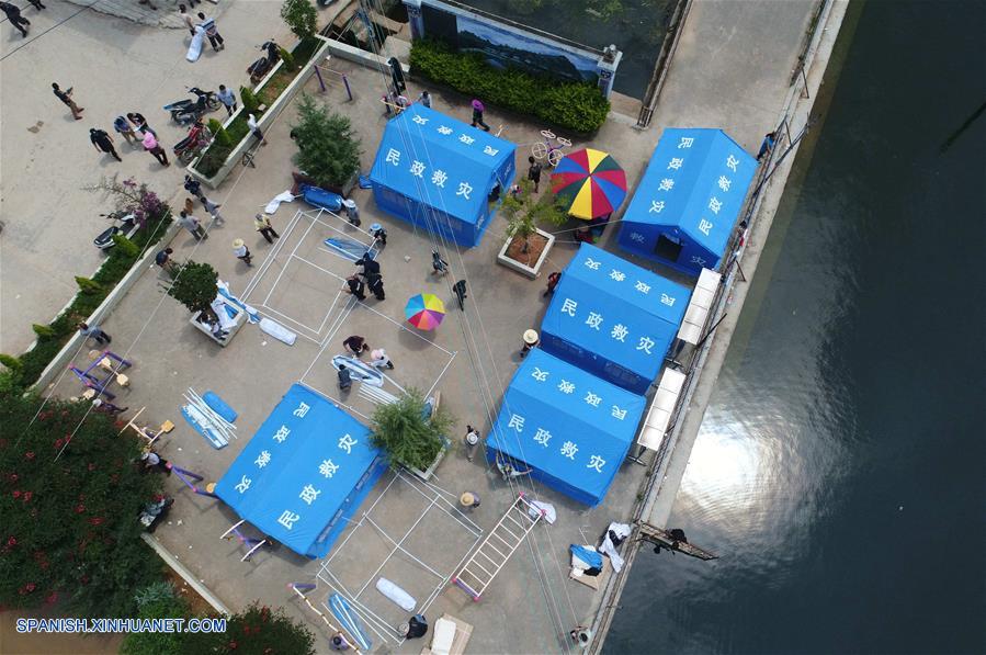 YUNNAN, agosto 13, 2018 (Xinhua) -- Vista de casas de campa?a temporales en el municipio Sijie del condado de Tonghai, provincia de Yunnan, en el suroeste de China, el 13 de agosto de 2018. Dieciocho personas resultaron heridas en un sismo de magnitud 5 que sacudió la ma?ana del lunes la provincia de Yunnan, en el suroeste de China, informaron las autoridades locales. El sismo afectó a más de 48,000 residentes en los distritos de Tonghai, Huaning y Jiangchuan, todos administrados por la ciudad de Yuxi. Más de 6,000 hogares resultaron da?ados, dice un comunicado del departamento provincial de asuntos civiles. (Xinhua/Wang Anhaowei)