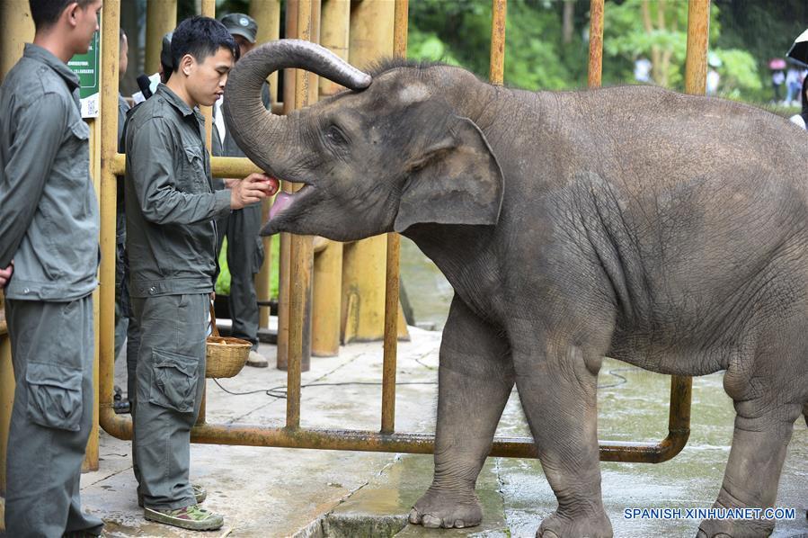 YUNNAN, agosto 12, 2018 (Xinhua) -- Un cuidador alimenta al elefante rescatado Yang Niu en el marco del Día Mundial del Elefante, en Xishuangbanna, provincia de Yunnan, en el suroeste de China, el 12 de agosto de 2018. Un desfile y un festín de frutas especiales fueron llevados a cabo para celebrar el Día Mundial del Elefante. (Xinhua/Xie Ziyi)