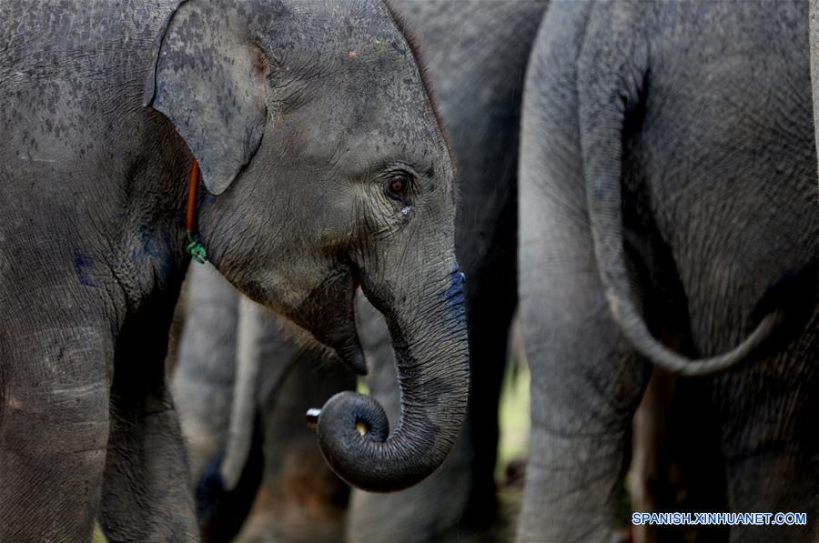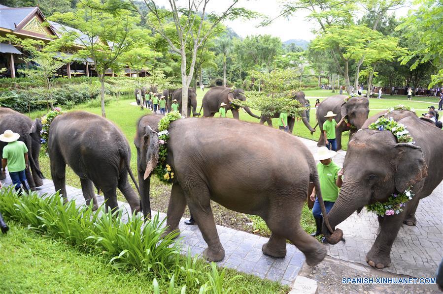 YUNNAN, agosto 12, 2018 (Xinhua) -- Elefantes avanzan hacia un desfile en el marco del Día Mundial del Elefante, en el punto escénico del Valle del Elefante Salvaje, en Xishuangbanna, provincia de Yunnan, en el suroeste de China, el 12 de agosto de 2018. Un desfile y un festín de frutas especiales fueron llevados a cabo para celebrar el Día Mundial del Elefante. (Xinhua/Xie Ziyi)