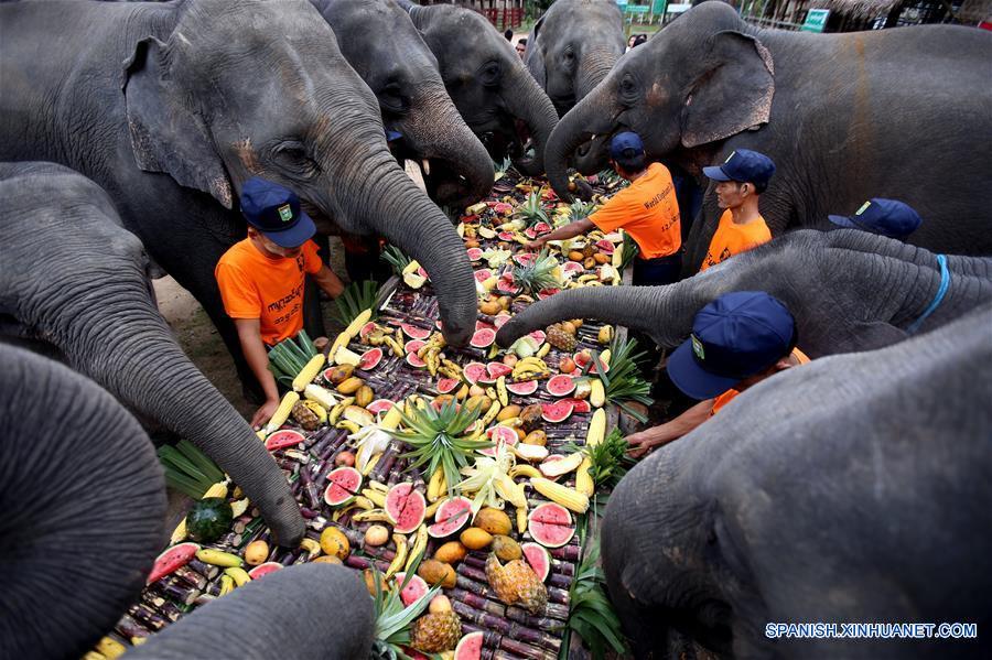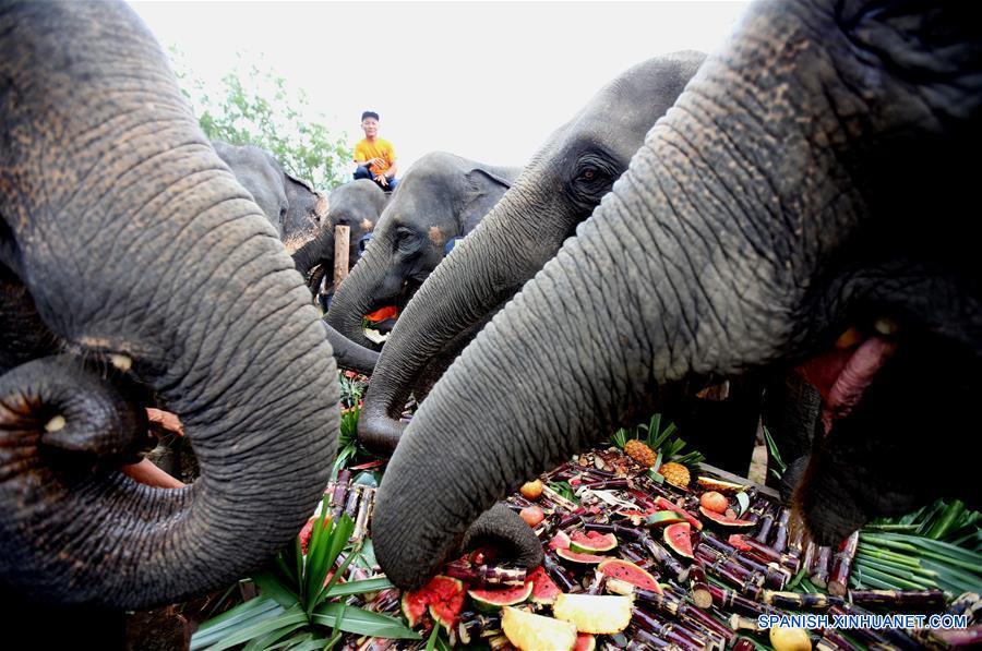 YUNNAN, agosto 12, 2018 (Xinhua) -- Elefantes disfrutan de un festín de frutas especiales en el marco del Día Mundial del Elefante, en el punto escénico del Valle del Elefante Salvaje, en Xishuangbanna, provincia de Yunnan, en el suroeste de China, el 12 de agosto de 2018. Un desfile y un festín de frutas especiales fueron llevados a cabo para celebrar el Día Mundial del Elefante. (Xinhua/Xie Ziyi)