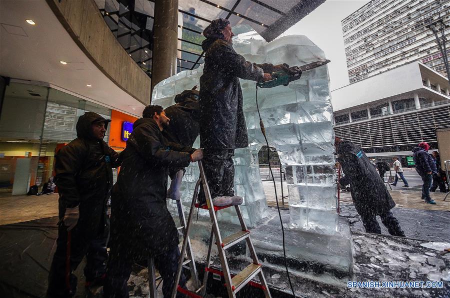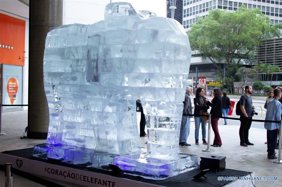 SAO PAULO, agosto 12, 2018 (Xinhua) -- Personas elaboran una escultura de hielo en forma de elefante, en la Avenida Paulista, en Sao Paulo, Brasil, el 12 de agosto de 2018. La escultura con casi 3 metros de altura y un peso de 6 toneladas, se trata de un acto para conmemorar el Día Mundial del Elefante, que se celebra el domingo para incrementar la conciencia sobre el riesgo de extinción de la especie. (Xinhua/Dario Oliveira/ESTADAO CONTEUDO/AGENCIA ESTADO)