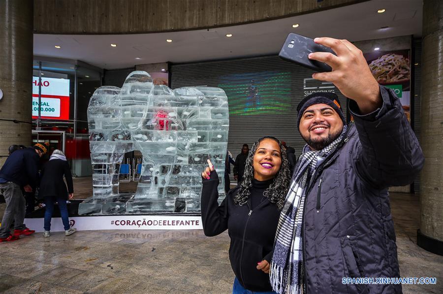 SAO PAULO, agosto 12, 2018 (Xinhua) -- Visitantes se toman una fotografía frente a una escultura de hielo en forma de elefante, en la Avenida Paulista, en Sao Paulo, Brasil, el 12 de agosto de 2018. La escultura con casi 3 metros de altura y un peso de 6 toneladas, se trata de un acto para conmemorar el Día Mundial del Elefante, que se celebra el domingo para incrementar la conciencia sobre el riesgo de extinción de la especie. (Xinhua/Dario Oliveira/ESTADAO CONTEUDO/AGENCIA ESTADO)