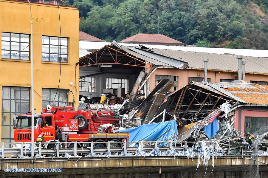 Vista de un puente parcialmente colapsado, en Génova, Italia, el 14 de agosto de 2018.(Xinhua/Alberto Lingria)